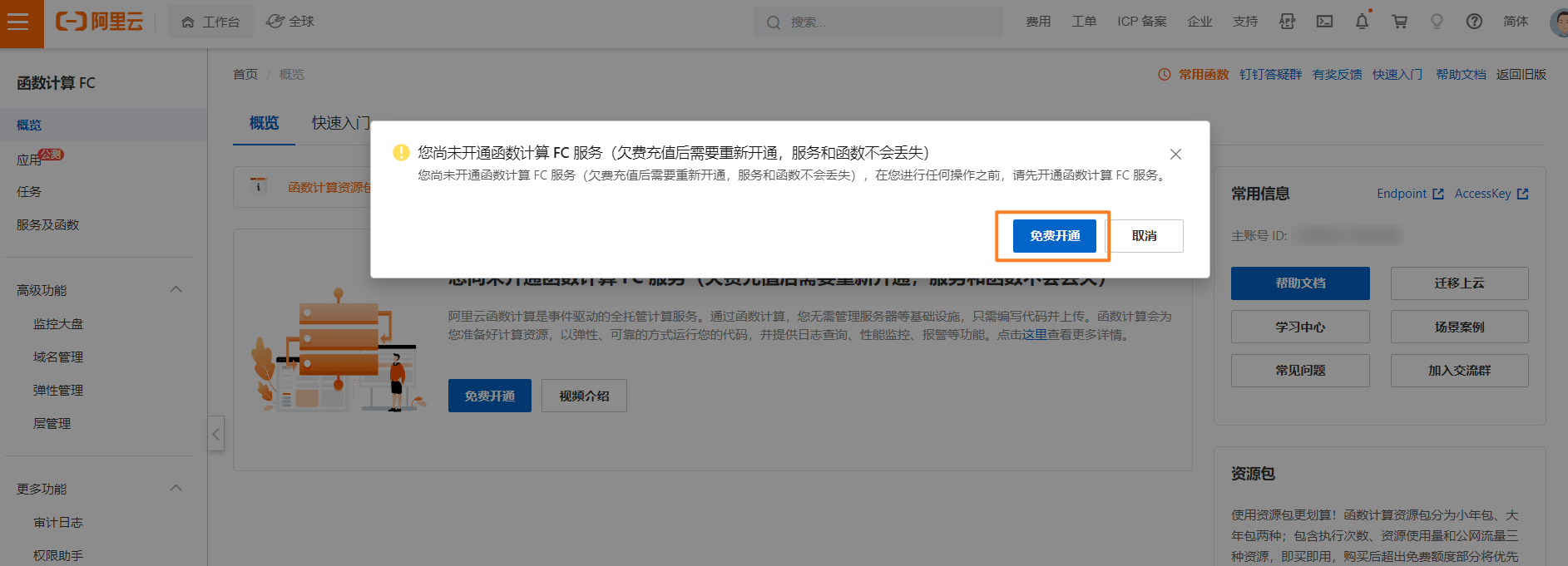 访问阿里云官网,注册后完成实名认证,并开通云函数、SLS 功能。